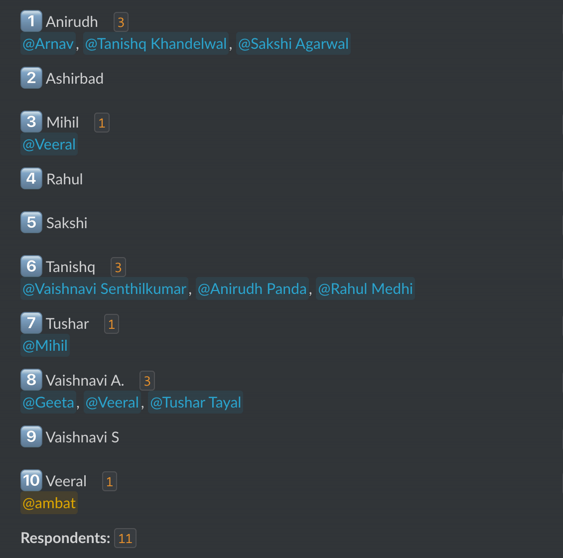 We did a second round of polls between Tanishq, Anirudh and ambat (Vaishnavi A)